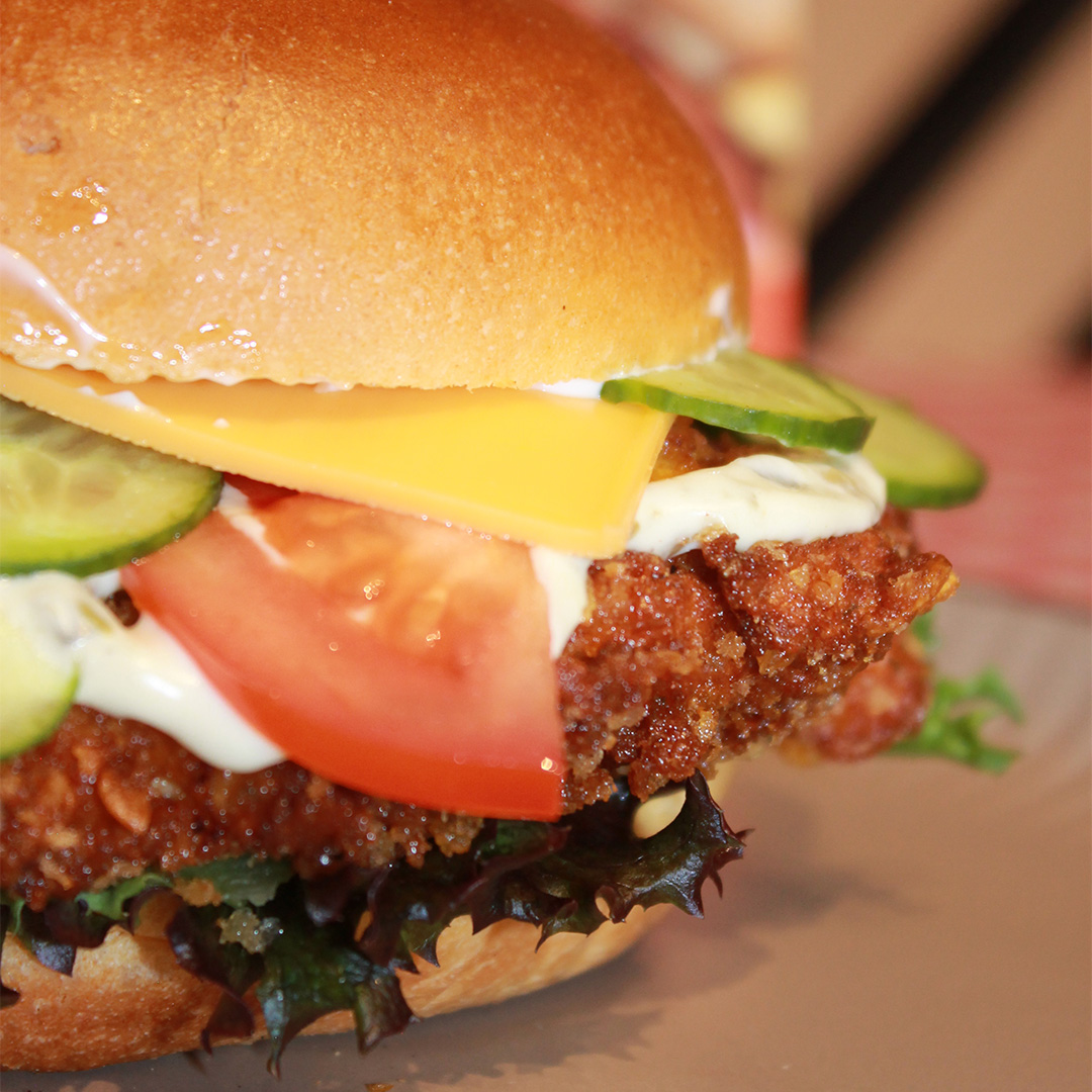 Paneret sprød kyllingefilet (220g) med salat, tomat, agurk, løg, cheddar ost & tartar sovs. Serveres i broiche bolle.